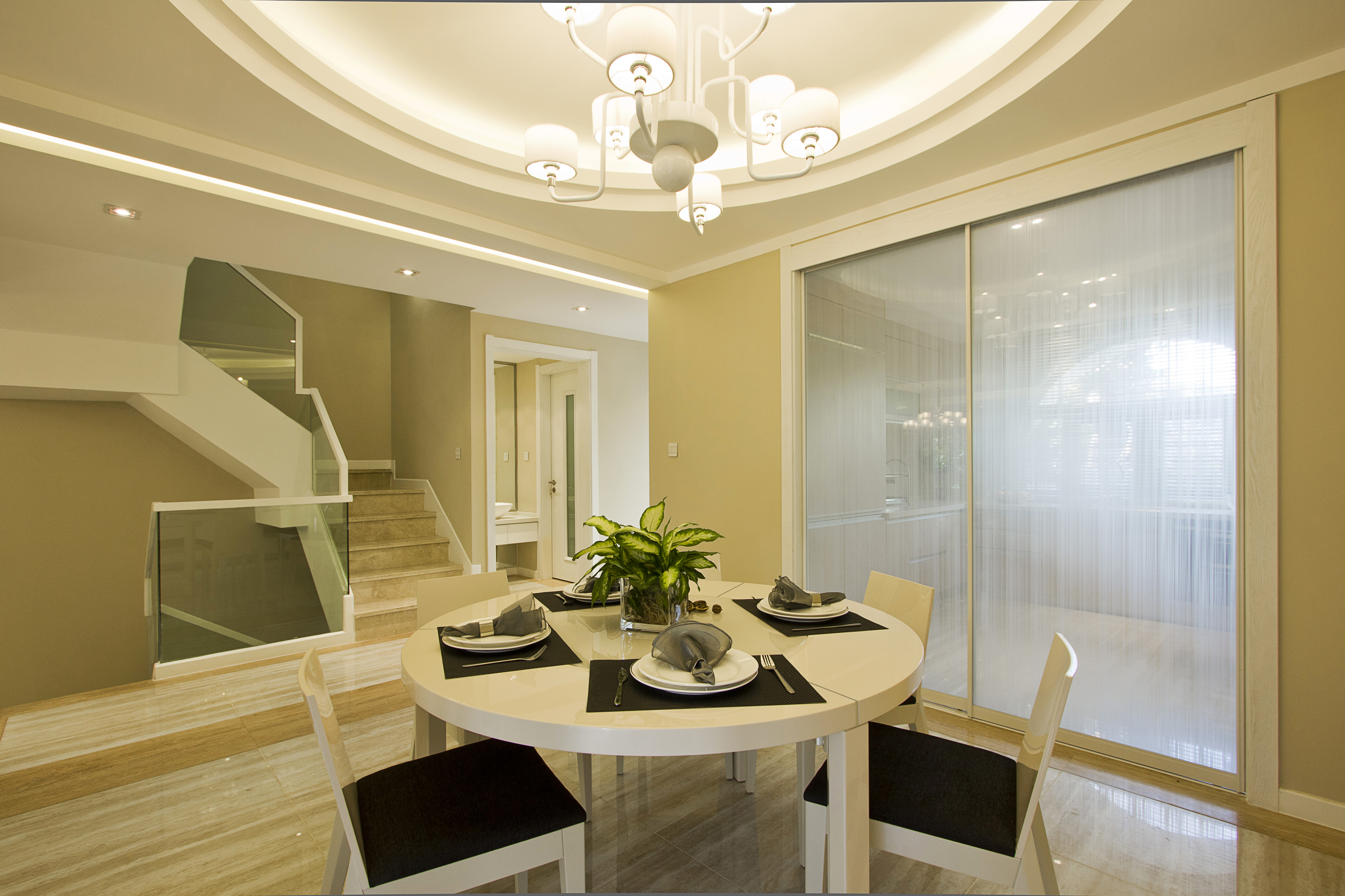 4、小户型餐厅要选择直射式的聚光灯,一般以吊灯为主灯,周边辅以射灯或漫射灯带营造气氛。主灯安装的高矮要以餐桌为参照物,以人坐下灯光不刺眼为适宜,主灯可以调节高矮那就更理想了。
