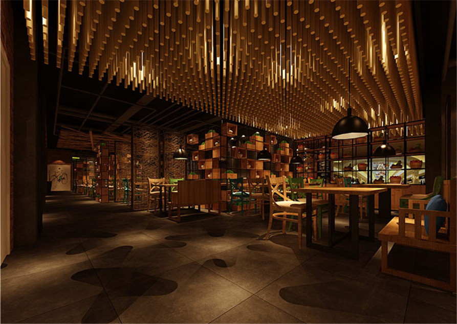 主题餐厅装修设计:多根木条组成的天花吊顶极为壮观,由不规则的木材特制的空间隔断也极具新意,给人以强烈的视觉冲击。