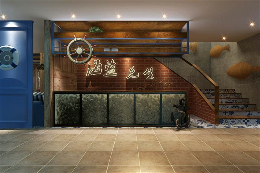 主题餐厅二楼入口设计:海盗往往与宝藏、船、海洋有关,这里给你的是一种回忆、一种文化、或是博君一笑的美好氛围,多方位感官刺激,将海盗具象在客户面前。