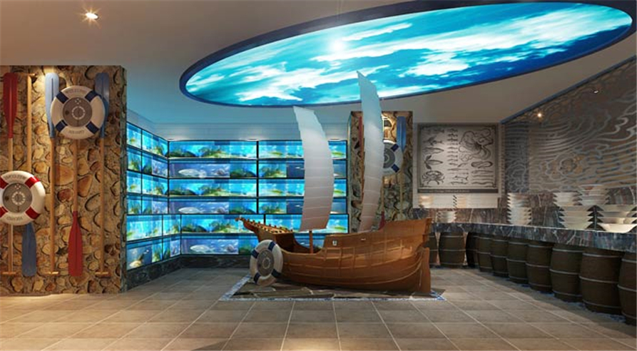 主题餐厅海鲜区设计:有海盗的地方就少不了海盗船,同时海盗船也往往带着神秘的色彩,譬如来无影、去无踪,这里让客户开心的不止是美食,而是真实的环境。