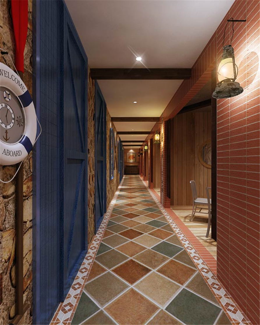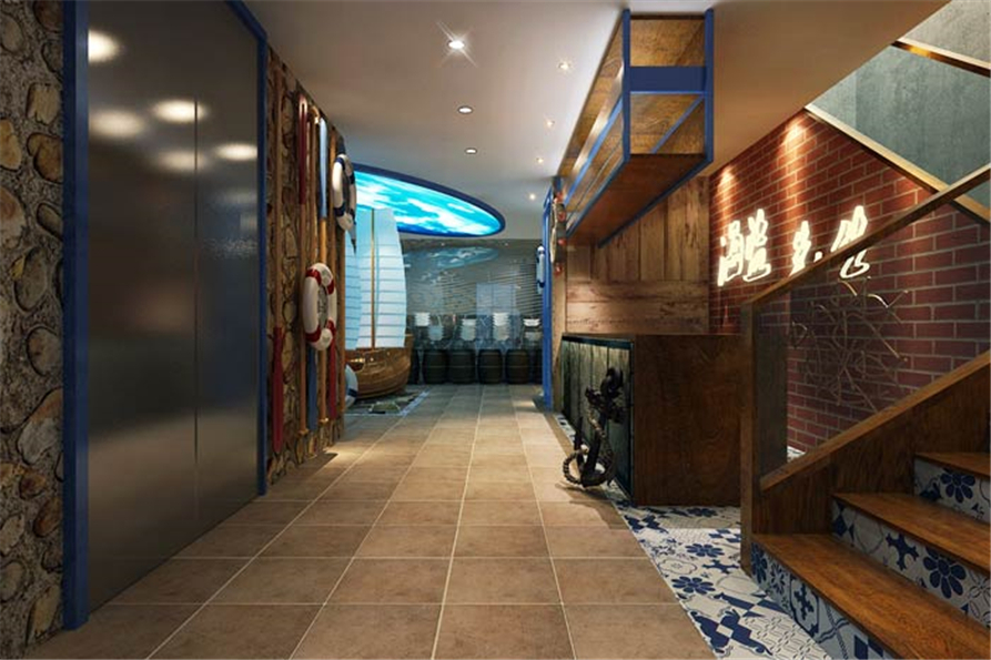 主题餐厅过道设计:当我们置身在过道之中的时候,我们仿佛置身在船舱的过道中,这也是设计师希望看到的,具象的元素让我们融入这里、享受这里。