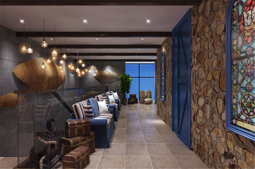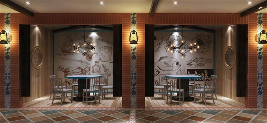 主题餐厅过道休息区设计:逼真的海上场景布置,让人仿佛回到了航海时期,仿佛徜徉在广阔的大海中,实木桌椅的设计,让人感受到最原始的真实。
