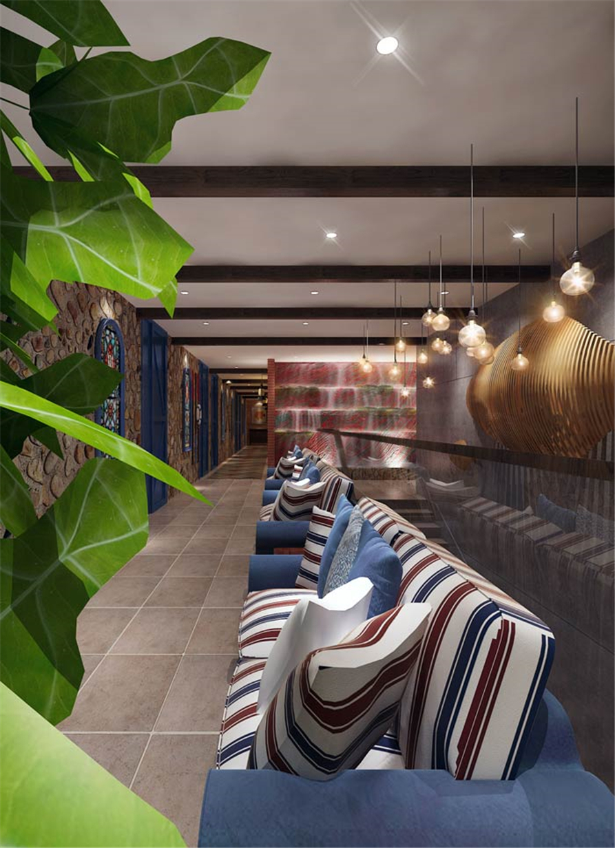 主题餐厅入口过道设计:蓝色、白色相间的色彩,让人感到一种魔幻之感,怀旧的蓝调、异域风情的音乐,让这里蕴藏着无限的遐想,让我们仿佛置身于那个年代。