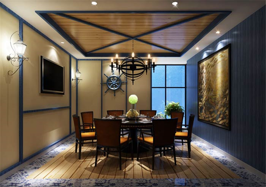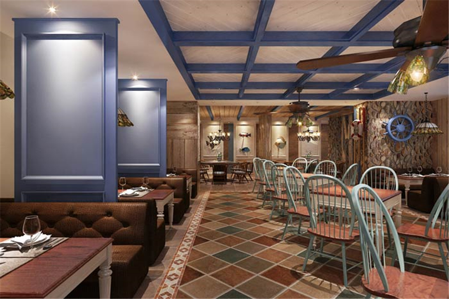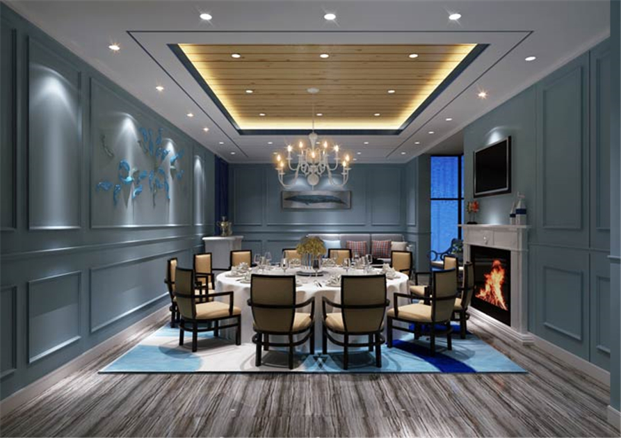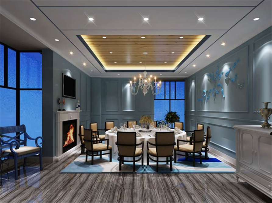 主题餐厅包厢设计:这里给人的第一感觉就是安静、舒适,在嘈杂的都市中,一个安静的就餐环境成为难事,在这里设计师借助海洋的宁静,打造安静、舒适的空间环境。