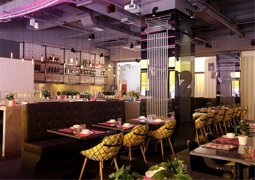 主题餐厅酒架设计:酒架位于吧台的内部墙体之上,酒架的引入改变了空间单调的空间氛围,在一定程度上让空间更有活力,将空间变的活力十足。