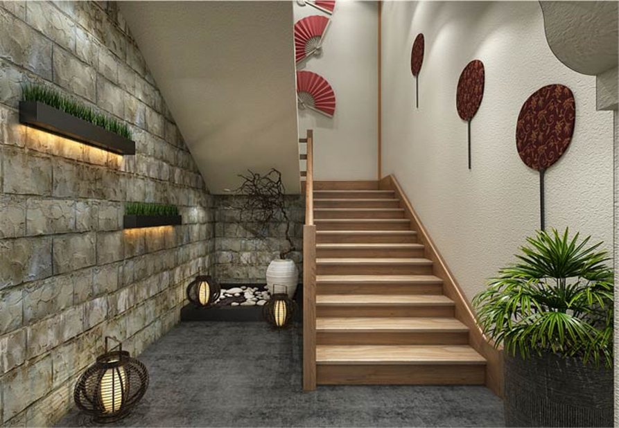 小型中式餐厅楼梯设计:在楼梯的设计中,设计师着重强调的是踏步的间距与高度,目的就是希望保证上楼的安全,这样的踏间距即安全又舒适,将危险降至最低。