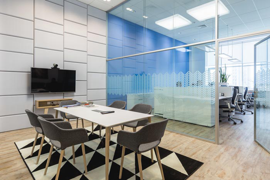 会议室的设计:此次位于办公区域的一边,这样设计也是受到空间面积的限制,在玻璃隔断上设计师采用了隔音玻璃,目的就是为了保证会议的正常运行,空间布局简单、便捷,让员工在这样的空间中可以自由发挥,在设计师看来会议的开展正该如此。