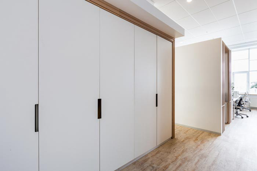 工具间的设计:设计师舍弃了一个工位,将其打造成工具间,这样设计的好处就是在不影响格局的前提下,将每一个区域都安排的恰如其分,同时此处也位于空间的中央,在无形上提升了工作的效率,设计师需要做的就是在满足需求的同时,并逐渐优化、细化设计。