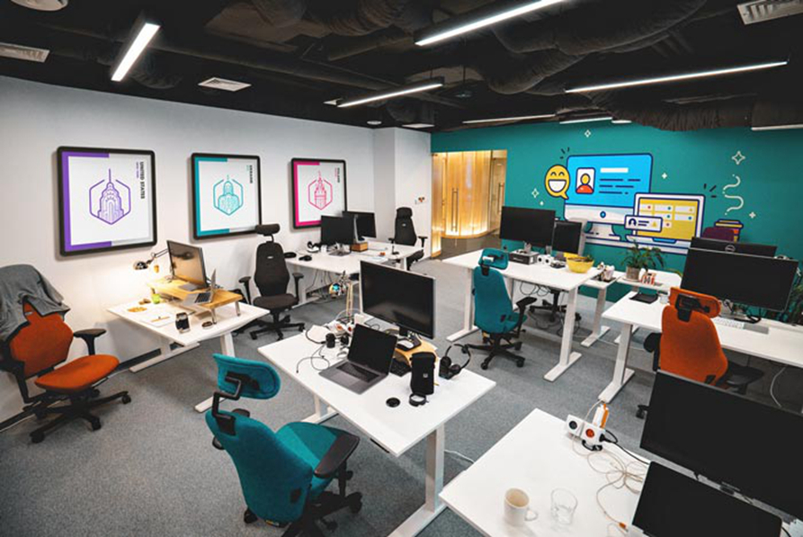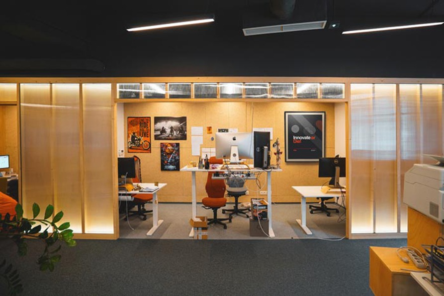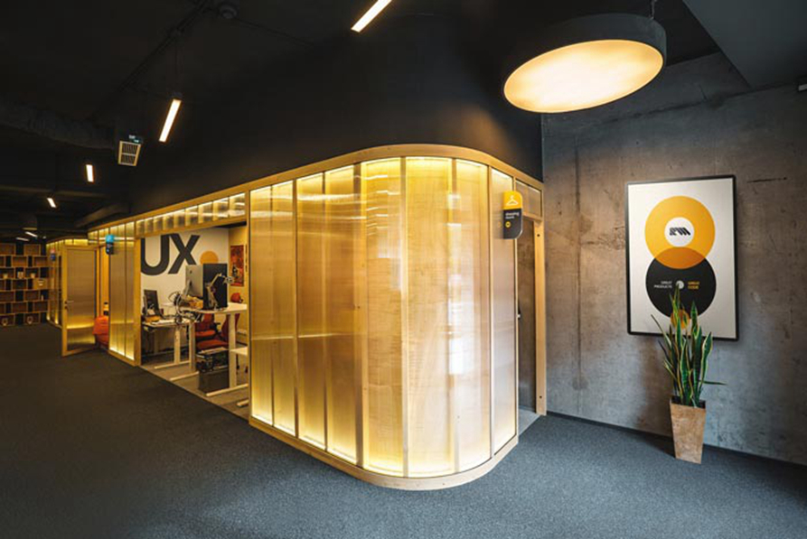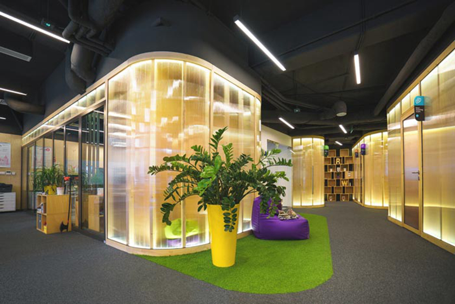 办公场所的设计:此处主要为后期测试与前端工作人员办公的场所,在这里开放与私人相互结合在一起,开放的空间让员工如一家人一样,私人的设计让员工拥有自己独立的办公空间,这样做的目的就是给每一个员工留下独立思考的空间,消除空间的弊端,让办公更加有趣。