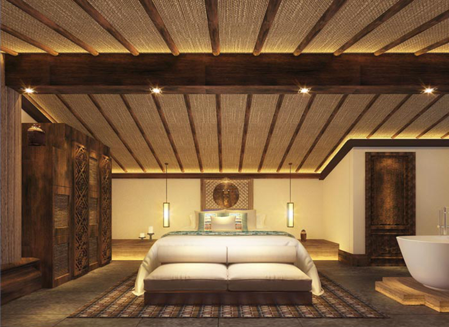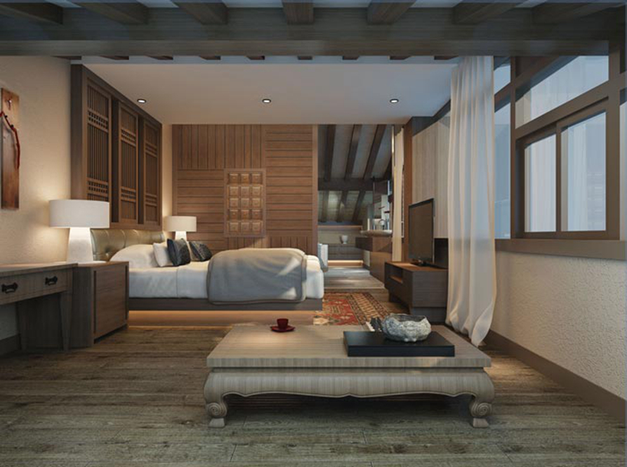 大床房的设计:此处给人的第一印象就是一张特大的床,摆放在空间的中央,其他几乎没有什么额外的装饰,但是仔细查看之下会发现,大床房的后面有一个冥想区,就是让客户在这里打坐、休息、看书,让客户在这里体会到冥想的魅力。