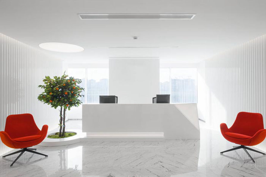 前台的设计:此处给人的第一感觉就是明亮、大气,这也是设计师希望看到的,在设计师看来企业想要发展,就要在无时无刻之中注意企业的想象,设计师的想法就是从设计开始,就追求极致的简约,给客户留下一个不错的第一印象,仿真植物也为空间带来勃勃生机。