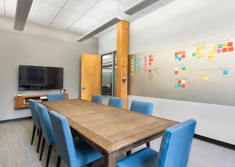 会议室的设计:设计师的重点在于释放空间的压力,也就是释放更多的空白空间,以此在会议开展的时候为企业带来更多的想象空间,想象空间就是希望让大家静下心来认真思考,同时也为大家提供了踱步的空间,希望通过动与静之间的互换达到快速解决问题的作用。