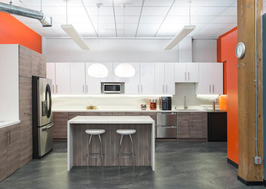 茶水间的设计:此处设计师以厨房为原型做为设计参考,目的就是将空间打造成一个集办公与家庭相结合的空间,让员工在办公的同时无时无刻都感受到家的温馨,这样对于企业的发展有很好的促进作用,设计师希望让关心、温暖成功企业的代名词,让关心、温暖成为企业发展产品的动力与原则。