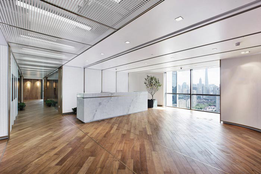 前台的设计:设计师在设计的时候,以外部动线为起点、依次向内,在设计师看来前台首先要解决的就是方便与便捷,故此设计师希望通过内外的相互连接,让客户可以自然而然的进入企业,这样就很好的解决了渠道的问题,其次就是前台区域坐落在落地窗的旁边,阳光的投射让客户感受到企业的实力。