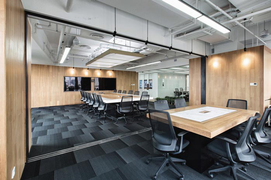 会议室的设计:设计师在设计的时候,打算设计一个小会议室与小会议室结合的会议空间,大会议室安置在空间的内部,小会议室安置在空间的外侧,两者之间呈一条直线分布,这样布局的好处就是为空间预留了足够的活动空间,活动空间与动线相互结合在一起,既保证了空间的通畅又保证了空间的正常运行。