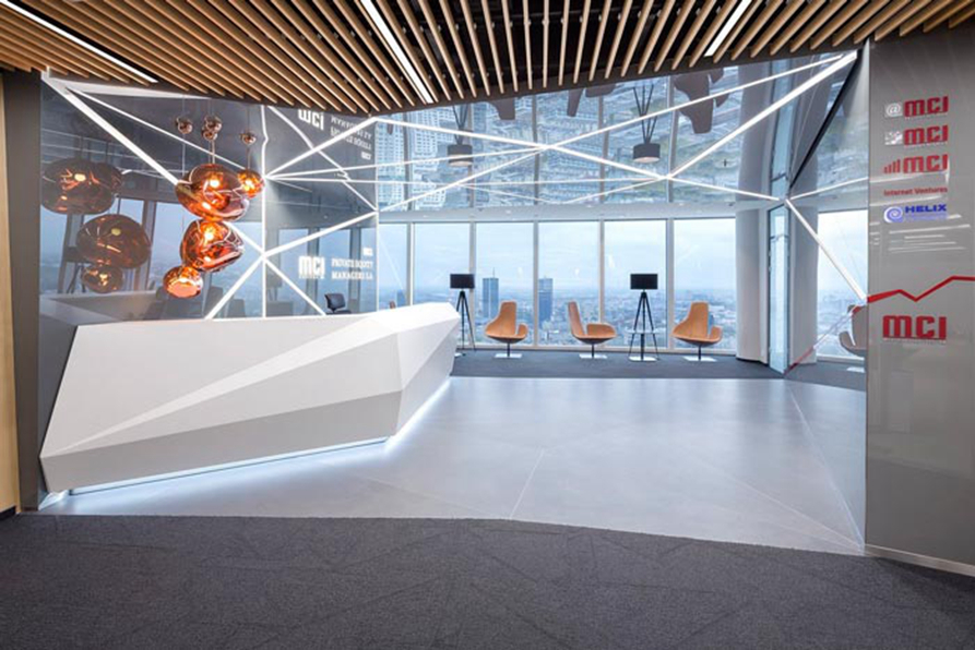 前台接待区域的设计:当客户进入空间之后,首先感受到的就是空间的大气与明亮,在设计师看来第一印象非常重要,故此设计师希望通过设计师的设计,让客户感受到企业的实力,同时客户可以透过窗户欣赏到整个城市的美景,在这里本身就是一种享受,在这里人的视野会越来越宽广,对于企业未来的发展十分重要。