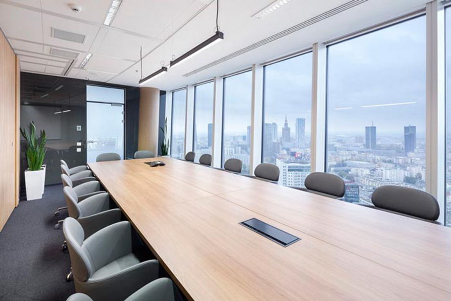 会议室的设计:此处给人的第一感觉就是视野非常宽敞,这也是设计师特意为之,在设计师看来会议本身要解决的,就是企业在发展过程中遇到的各种问题,故此大局观十分重要,此次会议室可同时满足24人参加会议,在这里设计师将室内空间与室外空间相互交融在一起,让人仿佛置身于自然中一般,以此提升大家的大局观念。