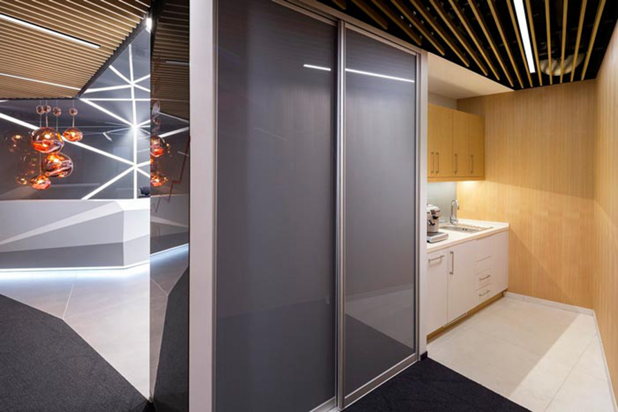 独立茶水区的设计:此处位置的设计十分巧妙,设计师将其安置在接待区域与办公区域之间,这样做的好处就是一方面可以供接待客户之用,另一方面可以方便内部员工使用,这样设计的好处就是无形中加快办公的效率,同时将此处空间合理的加以利用,以此增加空间的多元化,设计师的目的就是让办公更加方便。