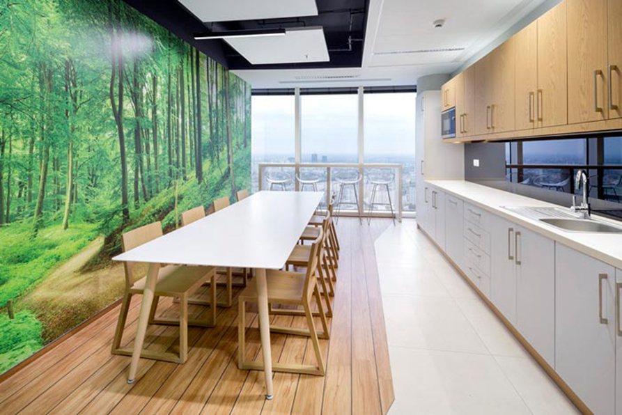 茶水间的设计:此处位于一个独立的空间之中,与休息空间相互结合在一起,设计师这样做的目的,就是希望给员工打造一个减压的空间,在这里员工可以远离办公带来的压力,带来暂时的缓解,在这里员工可以相互交流、相互攀谈,在这里看看风景也不失为一个好的主意,设计师要做的就是让员工在这里可以忘却烦恼。