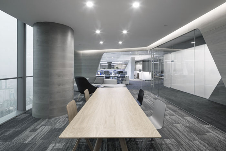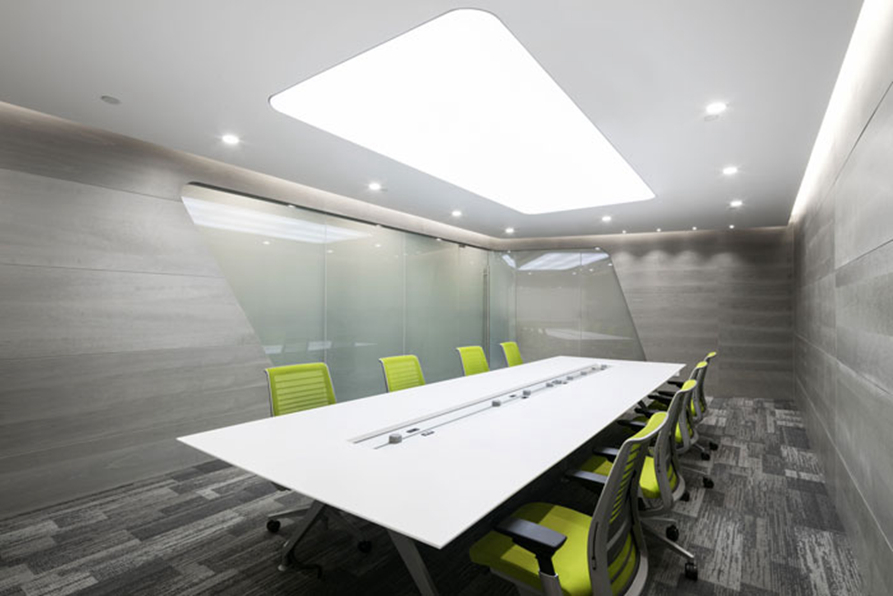 会议室的设计:灰色的地毯加上柔柔的灯光,让整个空间显得格外轻松,灰色犹如似亮非亮,灯光代表似亮非亮已经成为过去,这表示着事情已经解决,设计师希望通过这样巧妙的设计,为会议的开展提供一丝助力,让人、空间、设计可以合为一体。
