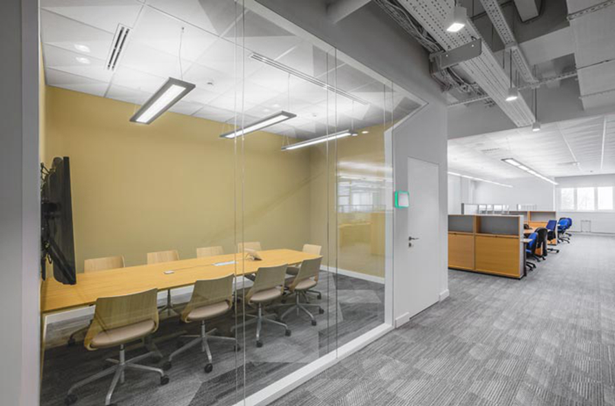 小型会议室的设计:这样的空间还有好几个,几乎在每一处办公区域的附近都有一个,这样就是为每一个办公区域都配置相应的辅助空间,这样展现出企业的管理模式,部门与部门之间分开管理,这样的好处就是减轻上层领导的压力,同时关注到每一个人。