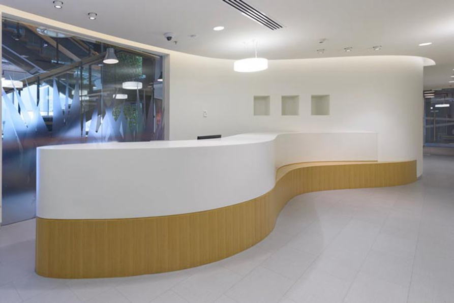 前台的设计:进入空间之后首先看到的就是流线型的设计,这是设计师根据空间的特性所设定的,同时前台的设计也有指引的寓意在其中,波浪形的外型清楚的向人指引着前进方向,波浪总是一浪还比一浪高,寓意着企业如竹子花开一样节节攀升。