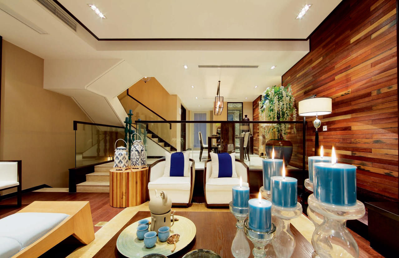 接下来说说,要打造一款富有古韵的中式大厅其实并不难,我们大家可以从家私和背景墙着手。还让主人选用磨砂玻璃和红棕色实木来打造背景墙,蓝白相间的毯子和小抱枕为空间注入了些许别样的色彩,红棕色的木地板让居室的温馨度提升不少。