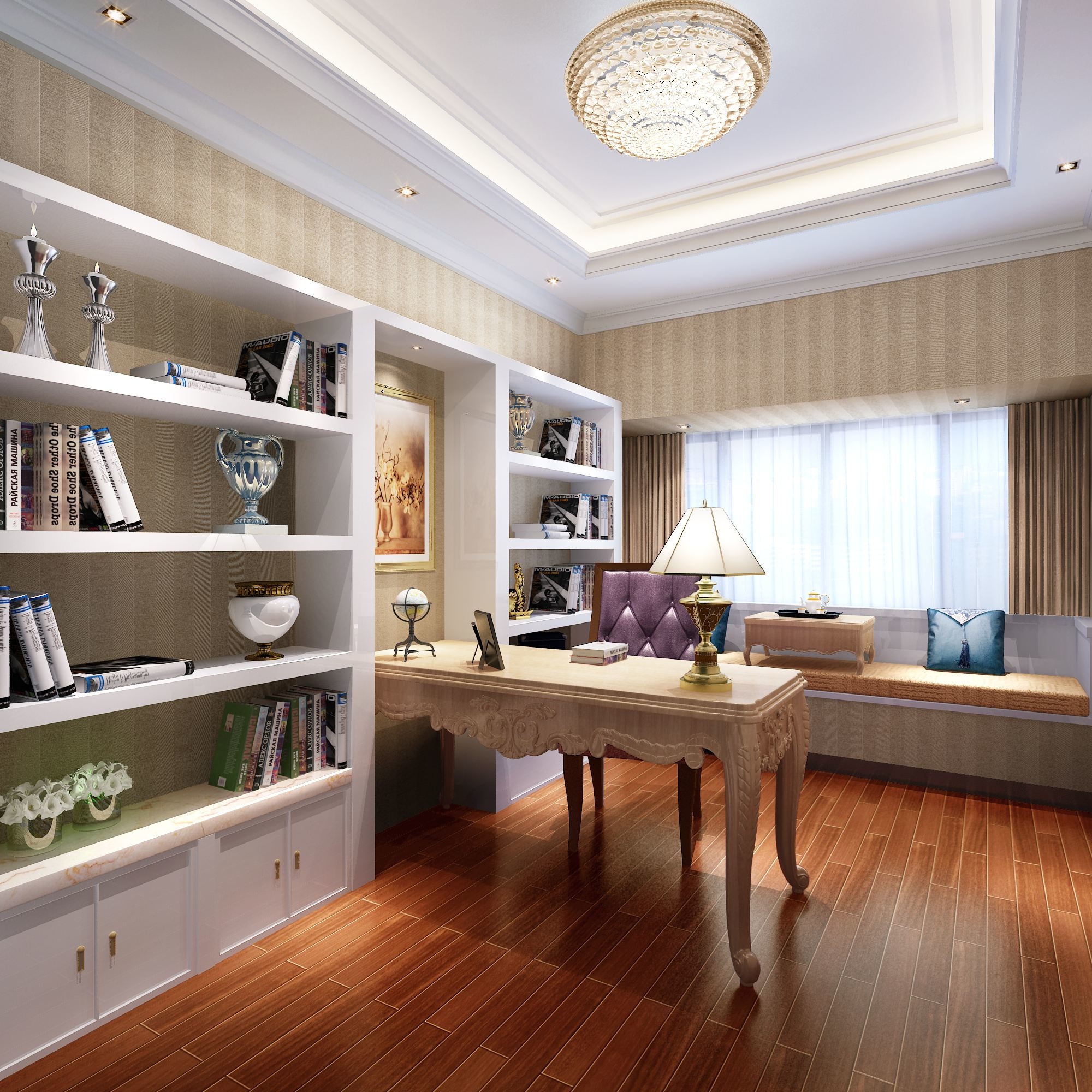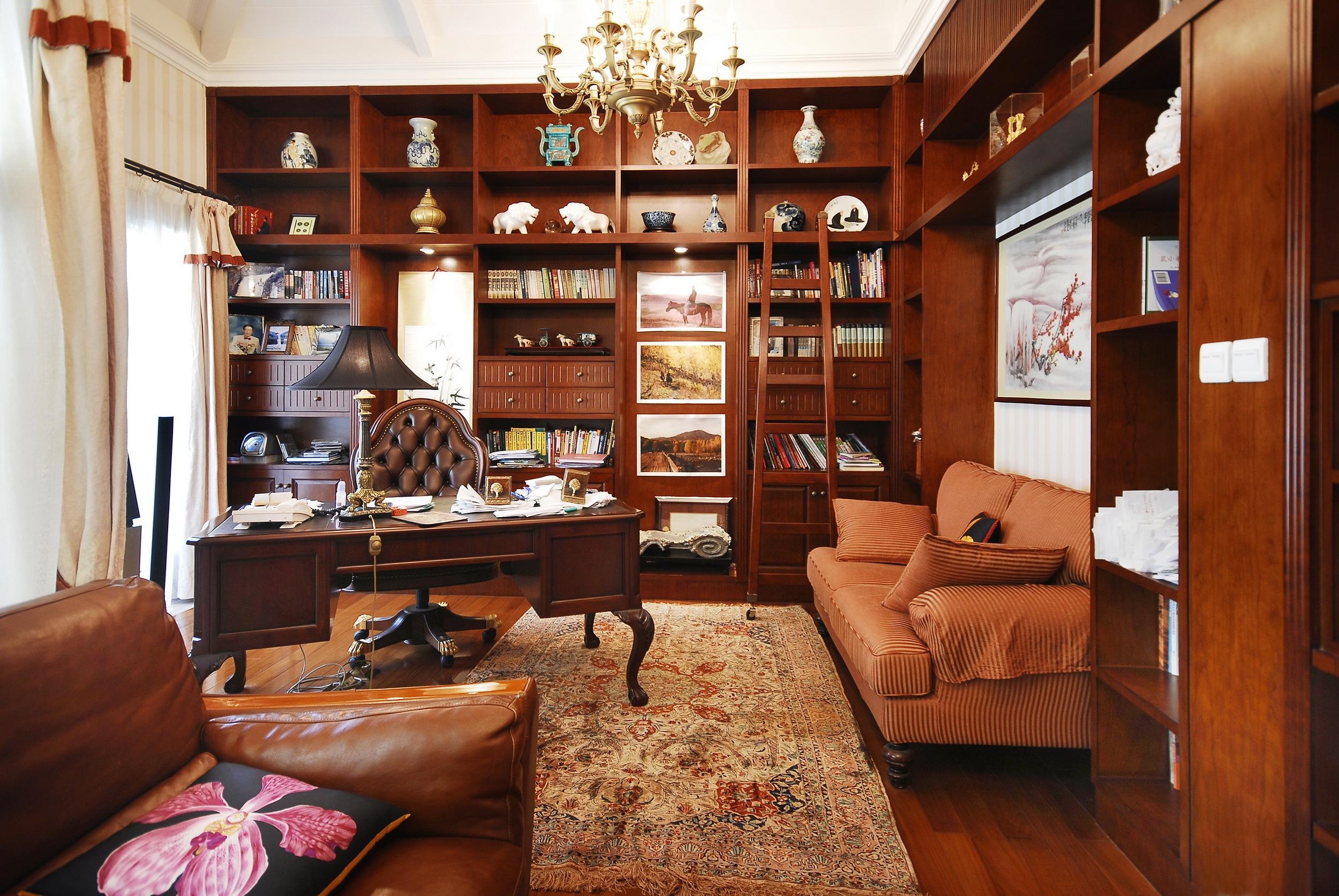 3、书房如果是正方形的,属于中等面积的书房,那么建议大家可以选择欧式书房的家具,这样显得你的书房有气质,而且欧式家具显得书房里面比较的宽大,自己在里面学习和工作会感觉舒适一些。