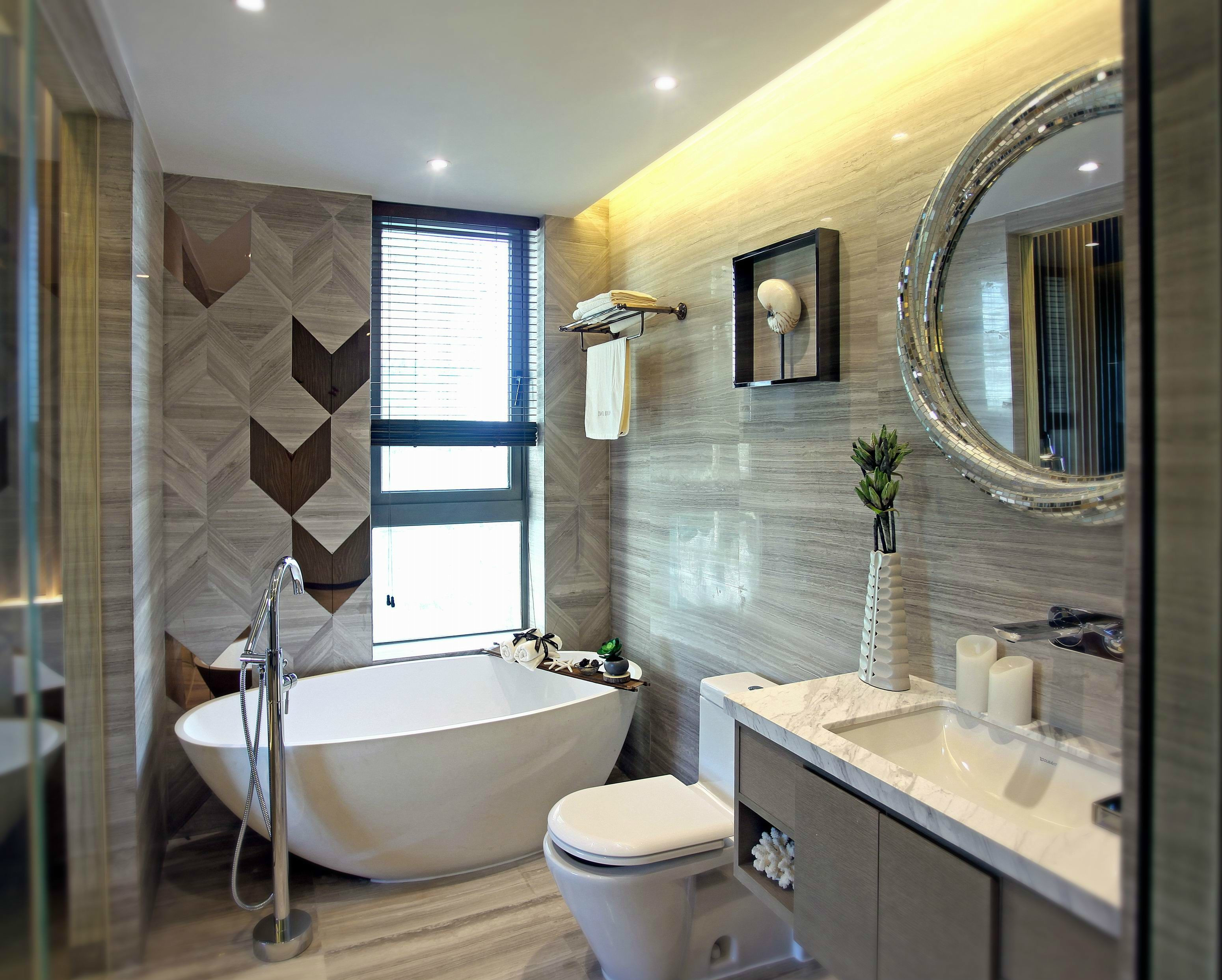 2、海域就是地面,在铺地砖之前,一定要做好防水,在瓷砖铺设之后,要确保砖面有一个泄水坡度(一般以1%左右为宜),坡度朝向地漏;地面在铺设完瓷砖之后必须做闭水实验,时间至少要保障24小时;铺设地砖时要注意与墙砖通缝、对齐,保证整个卫浴间的整体感,以避免在视觉上产生杂乱的感觉。